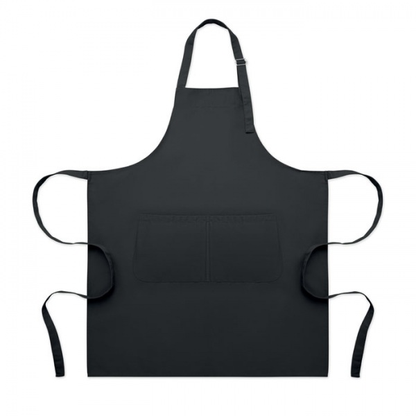 Dlhá nastaviteľná kuchynská zástera z polybavlny s gramážou 240 g/m2 (35 % bavlna, 65 % polyester) s dvoma prednými vreckami a nastaviteľným popruhom s kovovou prackou.