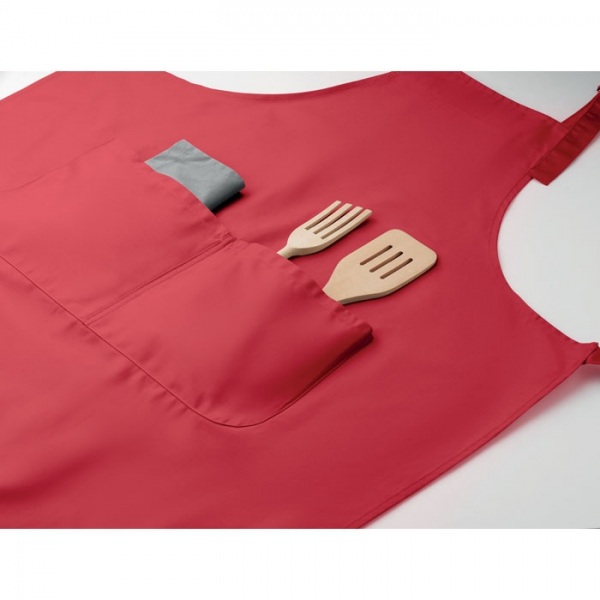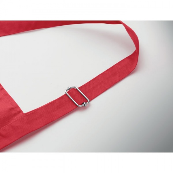 Dlhá nastaviteľná kuchynská zástera z polybavlny s gramážou 240 g/m2 (35 % bavlna, 65 % polyester) s dvoma prednými vreckami a nastaviteľným popruhom s kovovou prackou.