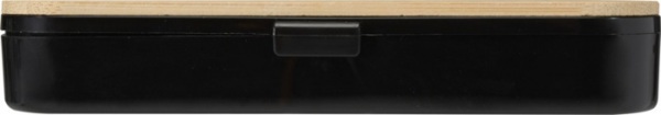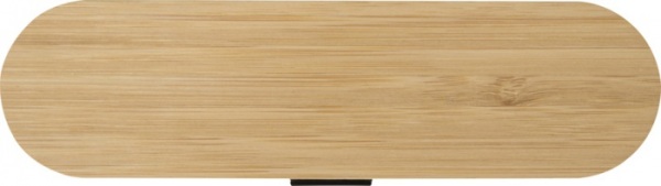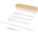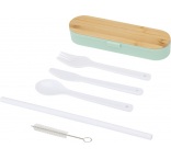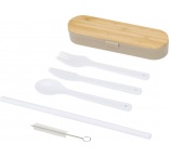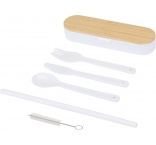 Súprava opakovane použiteľného príboru s bambusovým vekom, ktorá obsahuje vidličku, nôž, lyžicu, slamku a čistič slamky. Je kompaktný a ľahko sa čistí, takže je ideálny na použitie do desiatových boxov, pri cestovaní alebo v kancelárii.
