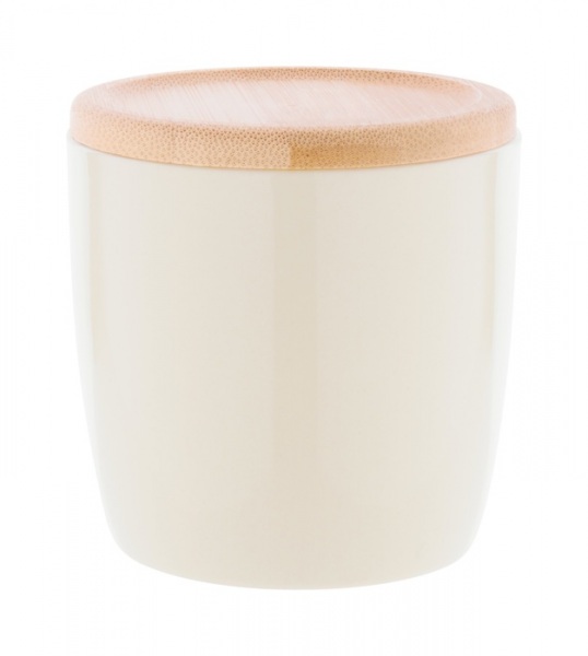 Vysoko kvalitný farebný keramický hrnček s bielym vnútrom a bambusovým podtáckom, 335 ml. V kraftovej papierovej krabici.