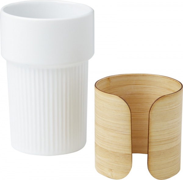 Štýlový keramický pohár s odnímateľným bambusovým návlekom, ideálny na použitie pri pití horúcich nápojov. Bambus pochádza z udržateľných, ekologicky a sociálne zodpovedných zdrojov. Objem: 340 ml. Dodáva sa v darčekovej krabičke z recyklovanej lepenky.