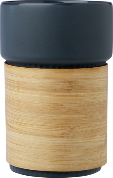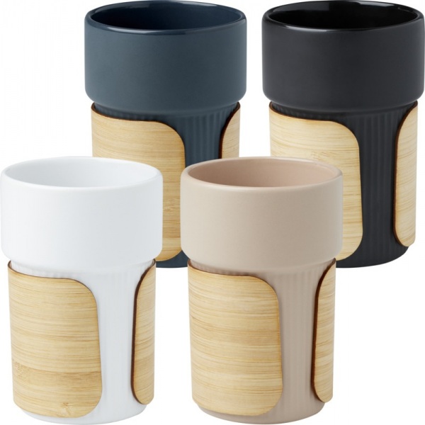 Štýlový keramický pohár s odnímateľným bambusovým návlekom, ideálny na použitie pri pití horúcich nápojov. Bambus pochádza z udržateľných, ekologicky a sociálne zodpovedných zdrojov. Objem: 340 ml. Dodáva sa v darčekovej krabičke z recyklovanej lepenky.