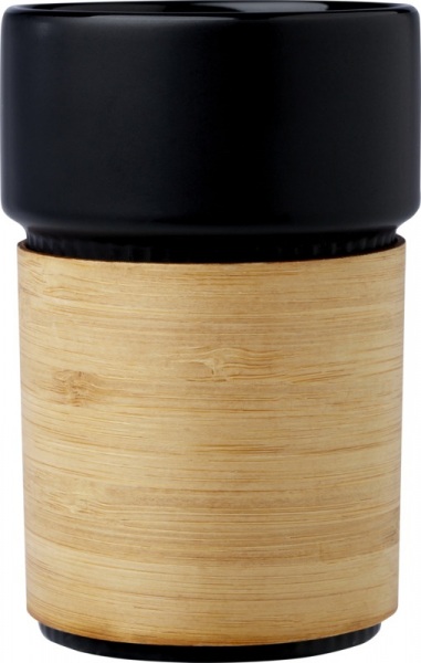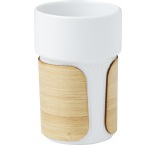 Štýlový keramický pohár s odnímateľným bambusovým návlekom, ideálny na použitie pri pití horúcich nápojov. Bambus pochádza z udržateľných, ekologicky a sociálne zodpovedných zdrojov. Objem: 340 ml. Dodáva sa v darčekovej krabičke z recyklovanej lepenky.