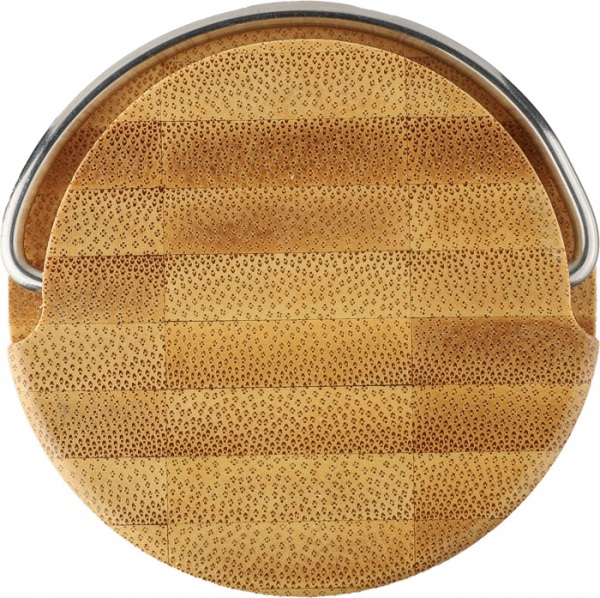 Sklenená fľaša na pitie (500 ml) s bambusovým viečkom a kovovou rukoväťou. Jednotlivo balené v hnedej kartónovej krabici.