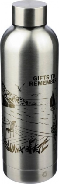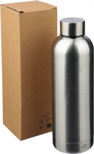 Fľaša z recyklovanej nehrdzavejúcej ocele (500 ml) s dvojitou stenou a matným povrchom. Jednotlivo balené v hnedej kartónovej krabici.