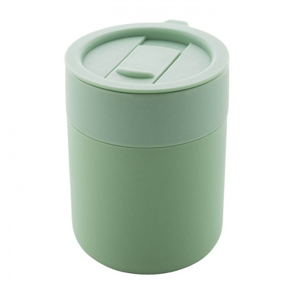 Silikónom potiahnutý keramický cestovný hrnček s PP plastovým odkvapkávacím viečkom. 300 ml.
