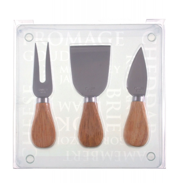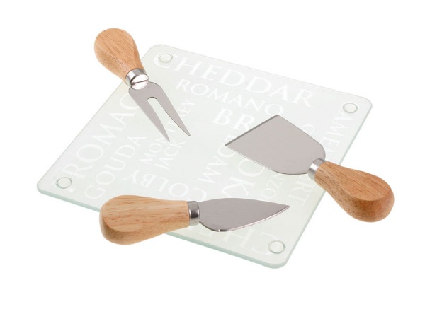 4-dielna sada na syr v darčekovom balení obsahuje: sklenenú dosku na krájanie a 3 nože z nerezovej ocele s drevenou rukoväťou.