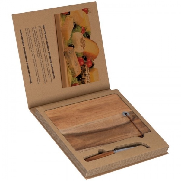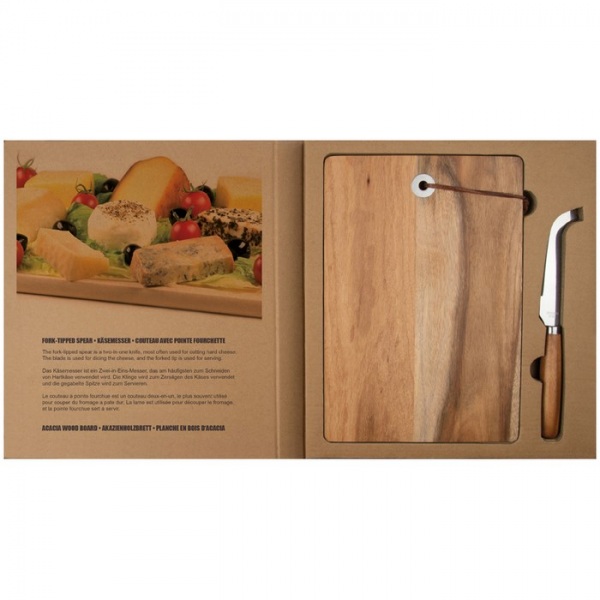 Sada na syr v ekologickom balení obsahuje drevenú dosku s koženým pútkom na zavesenie a nôž na syr z nerezu.