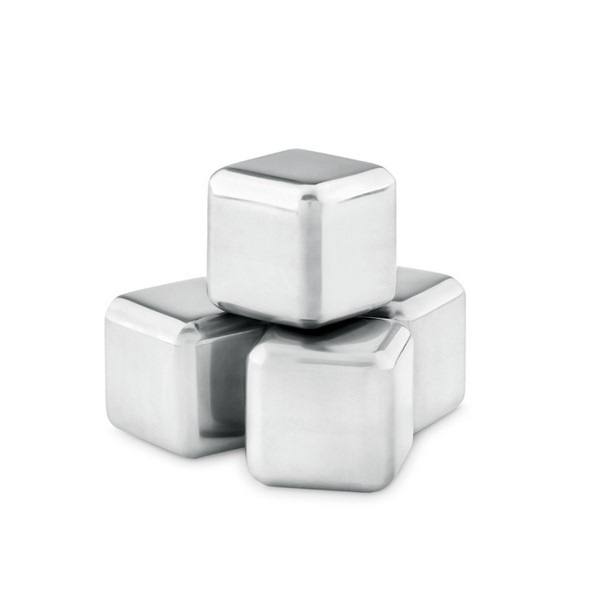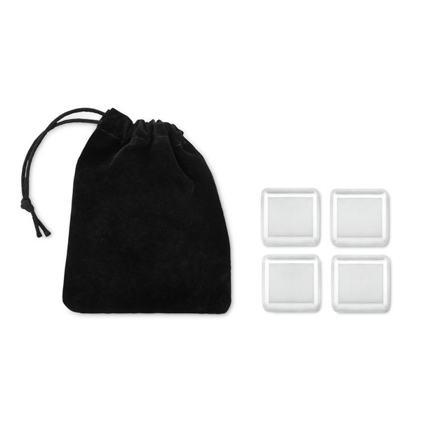 Sada štyroch znovupoužiteľných ľadových kociek z nerezovej ocele v zamatovom vrecku.