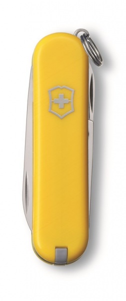 Originálny švajčiarsky vreckový nôž je vybavený funkciami: zatváracia čepeľ, pilník na nechty, čistič nechtov, nožničky, pinzeta, špáradlo, krúžok na kľúče.