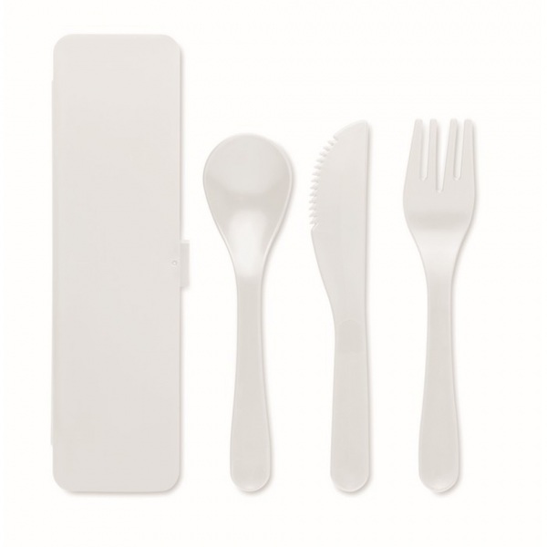 Opakovane použiteľná prenosná sada plastových príborov s puzdrom. Obsahuje lyžicu, vidličku a nôž.