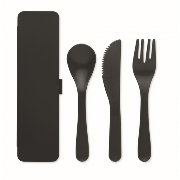 Opakovane použiteľná prenosná sada plastových príborov s puzdrom. Obsahuje lyžicu, vidličku a nôž.