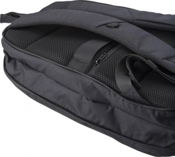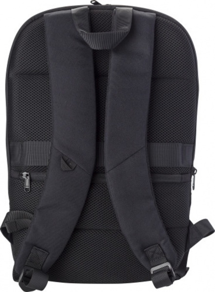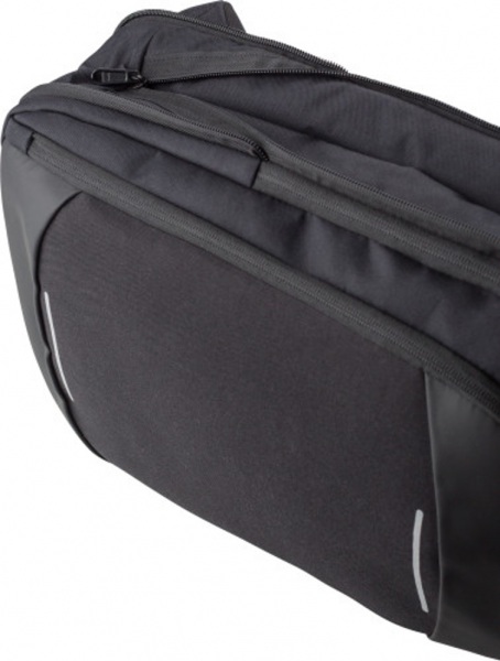 Polyesterový (600D) ruksak s polstrovanými nastaviteľnými popruhmi a so skrytým vreckom na zadnej strane. Reflexné prvky na prednej časti.
