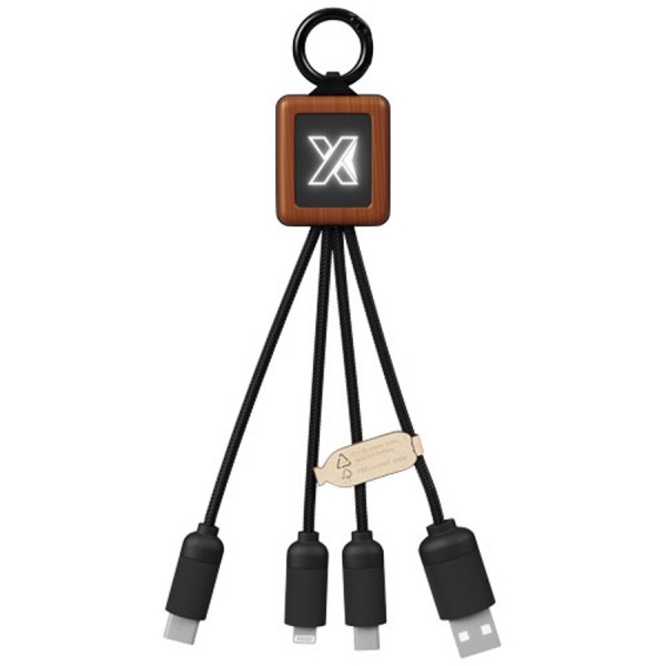 Dřevěný kabel 3 v 1 se světelným logem a 3 konektory (Type-C / micro USB / iPhone) a dráty vyrobene z recyklovaného PET plastu. Kabel může nabíjet až 3 přístroje současně. Patent EUROPE EUIPO.