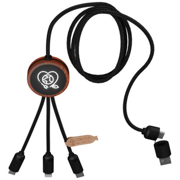Nabíjecí kabel 5v1 z RPET se svítícím logem a hranatým bambusovým pouzdrem. Svítící logo je viditelné na obou stranách. Má 3 konektory (typ C, micro USB, iPhone) a duální USB konektor pro univerzální použití. Délka kabelu: 1 metr.