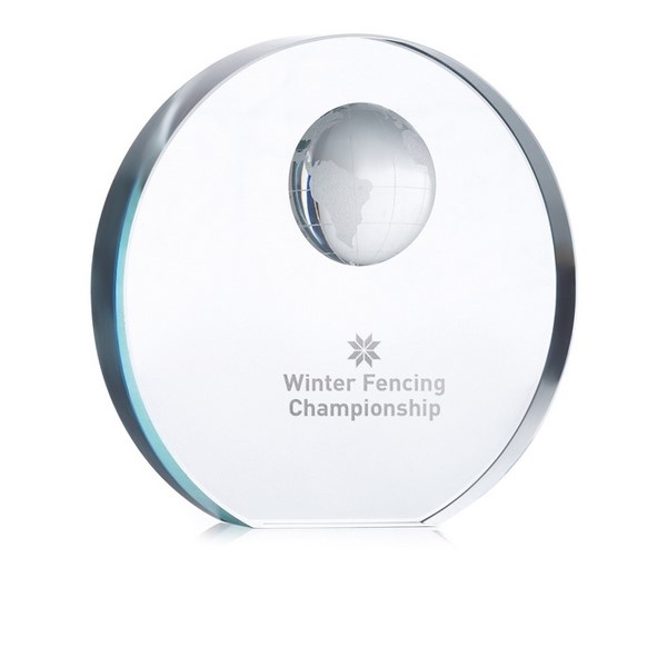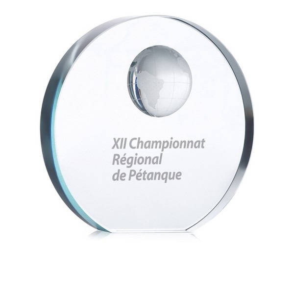 Sklenená guľatá trofej v hornej časti zdobená zemeguľou.