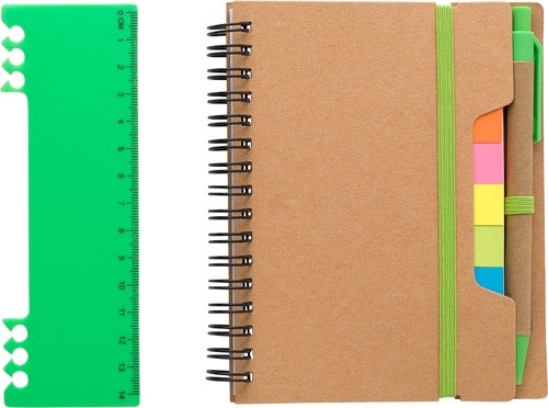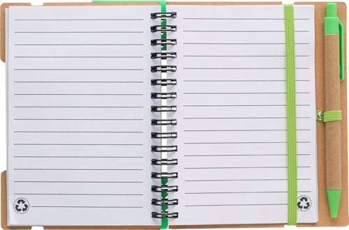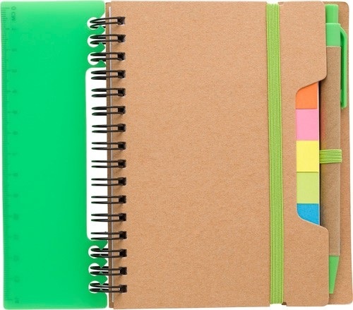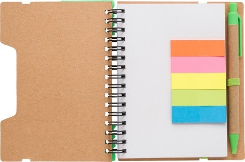 Recyklovaný zápisník so špirálovou väzbou so 60 stranami, guľôčkovým perom s modrým atramentom a samolepkami v 5 farbách.