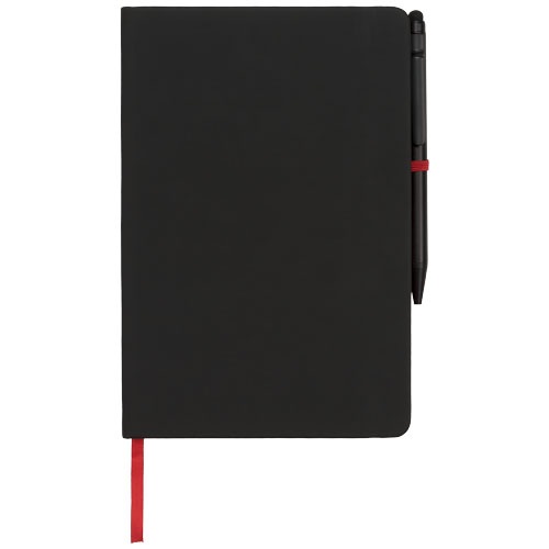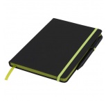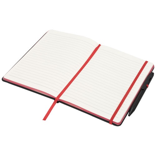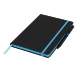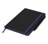 Dodávaný s farebným lemovaním, rovnako sfarbenou záložkou, pútkom na pero a elastickou gumičkou.