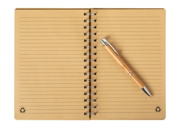 Blok A5 so špirálou v bambusových doskách s 80 linkovaným listami. Vr. guľôčkového pera z bambusu s čiernou náplňou. V Kraftovej papierovej škatuľke.