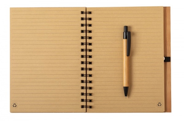 Blok A5 so špirálou v bambusových doskách s 80 linkovaným listami. Vr. guľôčkového pera z bambusu s čiernou náplňou.
