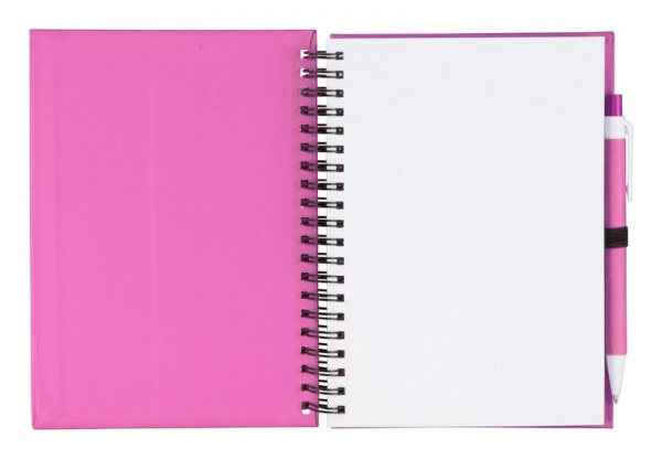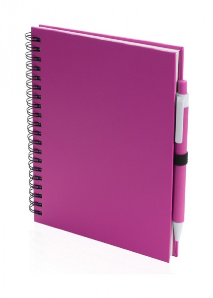 Poznámkový blok A5 sa 70 čistými listami a špirálovú väzbou v kartónových doskách, vr. rovnako farebného guľôčkového pera z recyklovaného papiera s modrou náplňou.