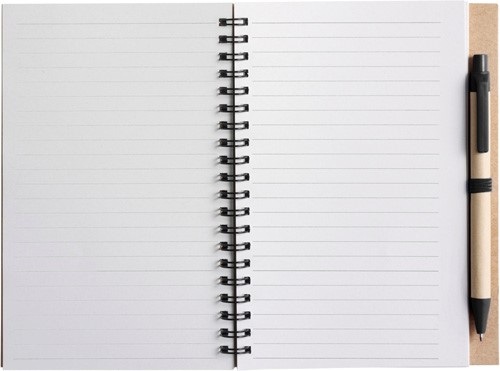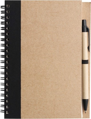 Zápisník z recyklovaného kartónu s krúžkovou väzbou, 60 linajkovými stranami a guľôčkovým perom (modrá náplňa) s biologicky odbúrateľnými časťami.