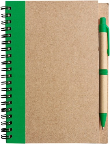 Zápisník z recyklovaného kartónu s krúžkovou väzbou, 60 linajkovými stranami a guľôčkovým perom s modrým atramentom.