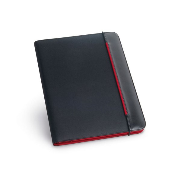Zložka A4 z PU a 800D s vnútrom z mikrovlákna. so zapínaním na gumičku. Obsahuje 20-listový blok s linkovaným papierom, 3 vrecká a držiak na pero (pero nie je súčasťou balenia)