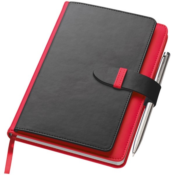 Zápisník A5 z PU s 256 linajkovanými stranami 128 listov, obsahuje držiak na pero a priestor na 6 vizitiek.