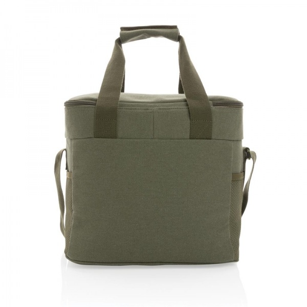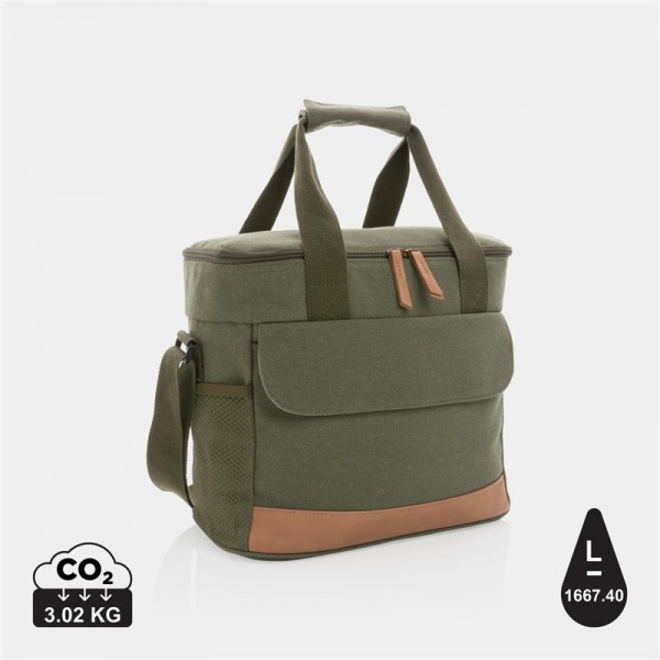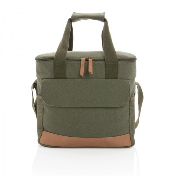 Chladiaca taška z 16 oz. recyklovaného canvas s detailmi z PU kože. Priestor pre 20 plechoviek, 2 bočné sieťové vrecká, 1 predné vrecko. Skenovateľná zložka AWARE™ garantujúca obsah recyklátu. 60% rec. bavlna, 40% rec. polyester, podšívka z PEVA.
