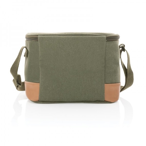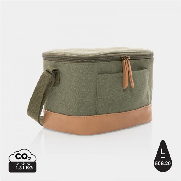 Chladiaca taška z 16 oz. recyklovaného canvas s elegantnými detailmi z PU kože. Priestor pre 6 plechoviek, predné otvorené vrecko. Vrátane skenovateľnej zložky AWARE™ garantujúcej obsah recyklátu. 60% rec. bavlna, 40% rec.polyester, podšívka z PEVA.