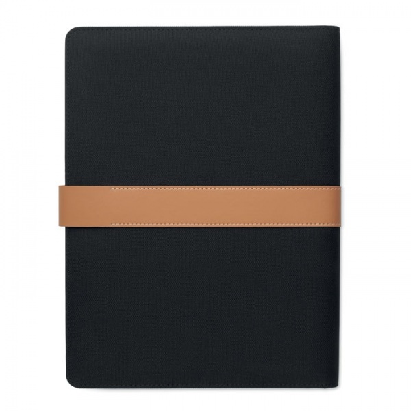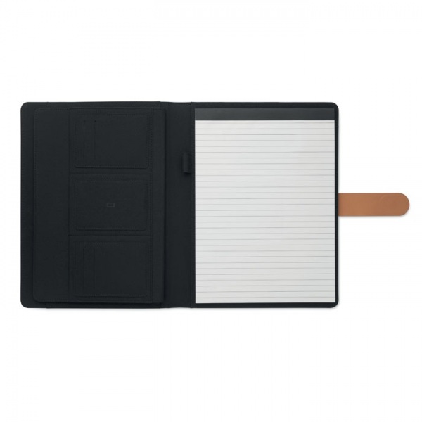 Portfólio A4 z RPET s detailmi z umelej kože. Vymeniteľný poznámkový blok A4. 30 linajkových strán z recyklovaného papiera. Držiak na perá. 4 držiaky na karty, 3 malé vrecká a jedna veľká priehradka. Magnetické zapínanie.