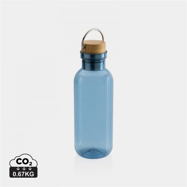 Nepriepustná fľaša s bambusovým uzáverom a madlom. 1-stenné telo fľaše z GRS recyklovaného PET plastu. Podiel recyklovaného materiálu: 56%. Bambusový uzáver s FSC certifikáciou. Len na studené nápoje a ručné umývanie. Bez BPA. Balené v FSC krabičke.