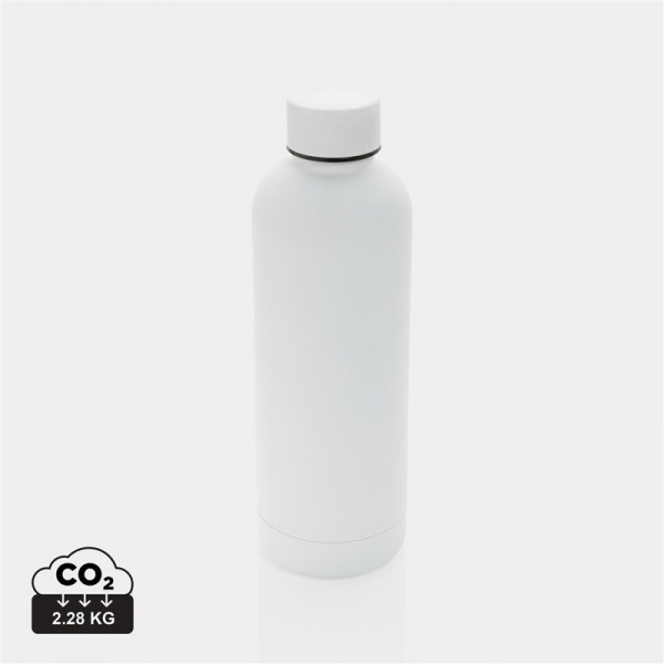 Dvojstenná vákuová fľaša. Nápoje ochová až 5 hodín horúce a až 15 hodín studené. Vyrobená z RCS recyklovanej ocele. Celkový podiel recyklátu podľa váhy produktu: 80%. Objem: 500 ml. Bez BPA. Balené v FSC® kraftovej darčekovej krabičke.