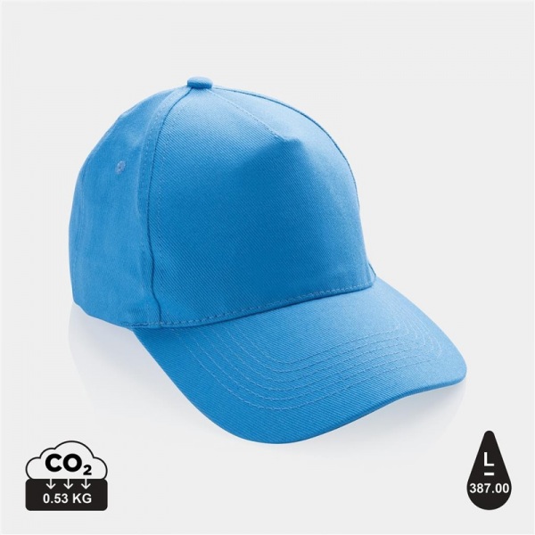 Táto čiapka ušetrila 387 litrov vody. Jednoduchá a pohodlná 5-panelová šiltovka, vyšívané vetracie otvory a kovová pracka. Bavlnený keper vyrobený zo 100% recyklovaných materiálov a AWARE™ tracer. Gramáž materiálu je 280 g/m2. Veľkosť 58 cm.