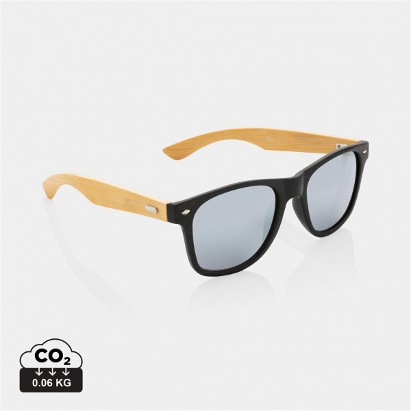 Slnečné okuliare z kombinácie RCS recyklovaného PC a FSC® bambusu. Celkový podiel recyklátu: 41%. Rám zo 100% recyklovaného PC. Zatmavené akrylové sklíčka sú v súlade s EN ISO 12312-1, UV 400 a CAT 3. Balené v FSC® kraftovej darčekovej krabičke.