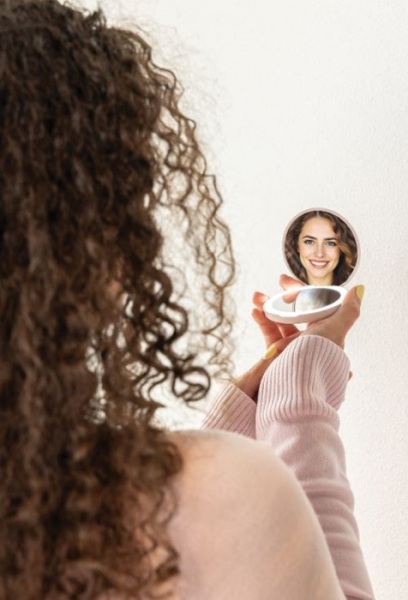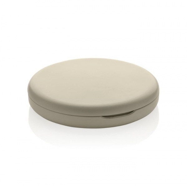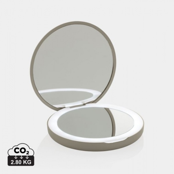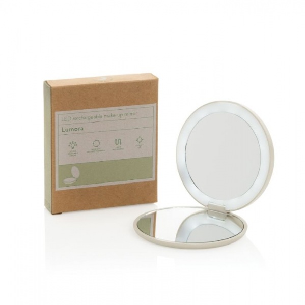 Elegantné vreckové zrkadlo s integrovaným LED osvetlením. Nastaviteľný režim svetla, zväčšujúce zrkadielko. 300mAh dobíjateľná batéria, ktorá sa nabíja cez USB-C. Celkový podiel recyklovátu: 46 %. PVC free. Krabička s certifikáciou FSC®.