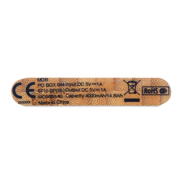 Powerbank s kapacitou 4 000 mAh, kryt z bambusu. Obsahuje konektor typu C.