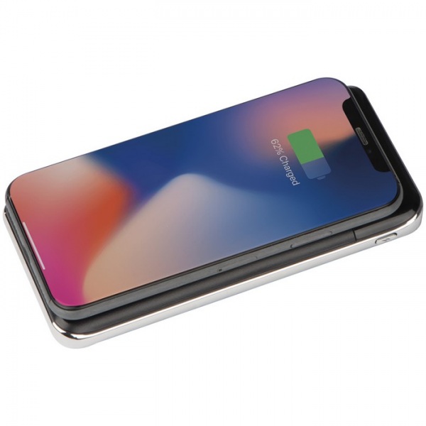 Bezdrôtový kovový powerbank s kapacitou 8 000 mAh a nabíjacím káblom USB.