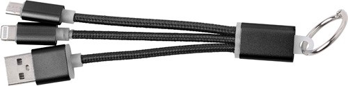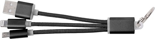 Hliníkový nabíjací kábel 3 v 1 s USB, USB-C a micro USB koncovkou.