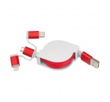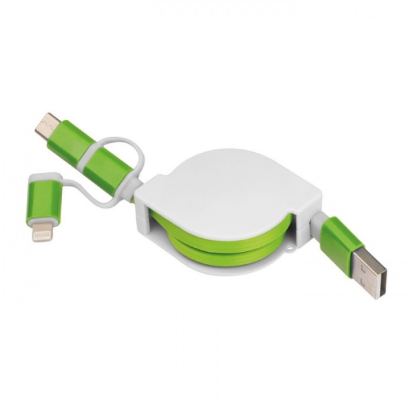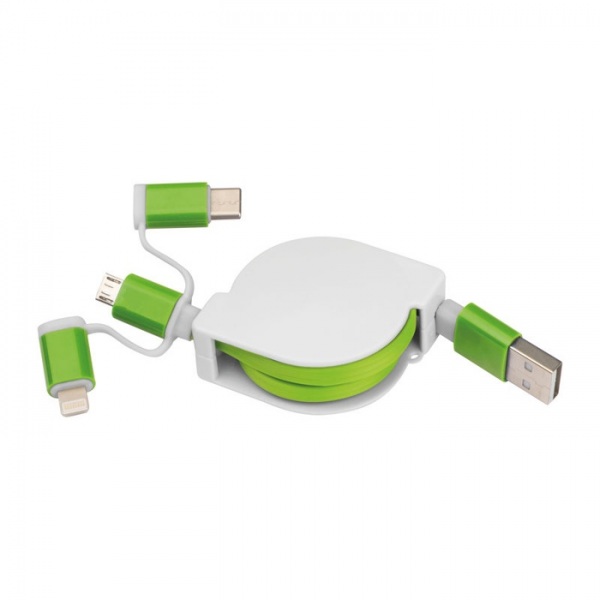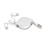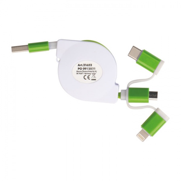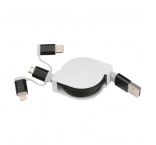 Vyťahovací nabíjací kábel v plastovom kryte s USB zástrčkou a pripojením iOS Lightning, C-Type a Micro USB. Nabíjací výkon max. 5V/2A. Dĺžka kábla cca. 80 cm.