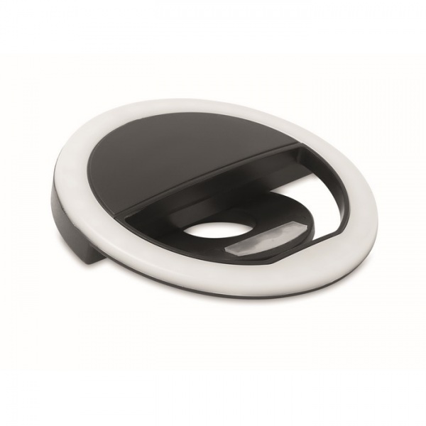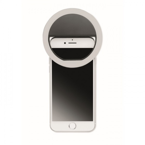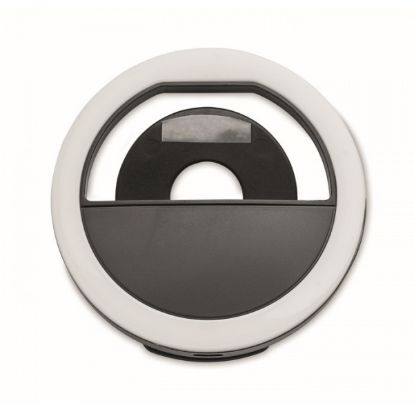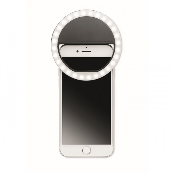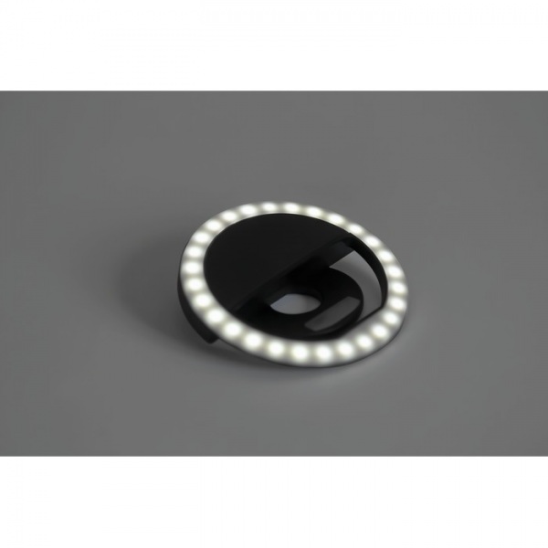 8 cm prenosné selfie kruhové svetlo s 28 LED diódami. Z ABS plastu. Biele svetlo nastaviteľné na 3 rôzne úrovne jasu. Dobíjacie batérie cez USB s kapacitou 80 mAh.