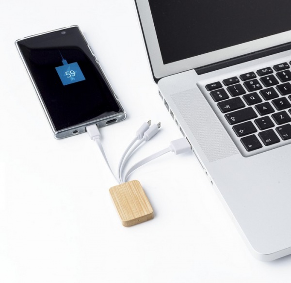 Bambusový nabíjací kábel tri v jednom so štandardným USB, micro USB, USB C a lightning konektorom.