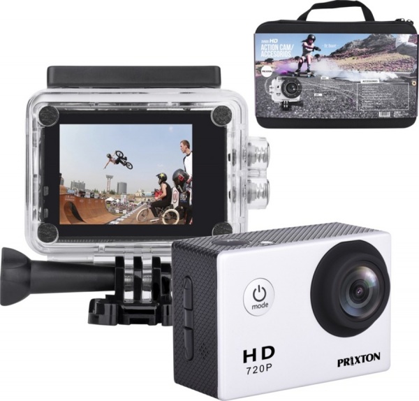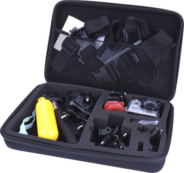 Vodeodolné puzdro, dlhá životnosť batérie a kompletná sada príslušenstva. Súčasťou je praktická taška na prenos kamery a doplnkov, ktoré umožňujú namontovať kameru na prilbu, motorku, či bicykel. Kábel micro USB.
