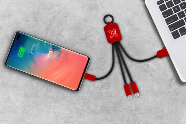 Nabíjací kábel so svetelným logom, gumeným povrchom, kovovými doplnkami a 3 výstupnými konektormi (USB-C, Android, iPhone). Možné nabíjať až 3 zariadenia súčasne. Dĺžka káblu (vrátane zástrčiek): 10 cm.
