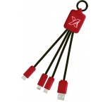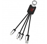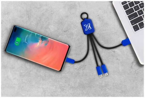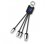 Nabíjací kábel so svetelným logom, gumeným povrchom, kovovými doplnkami a 3 výstupnými konektormi (USB-C, Android, iPhone). Možné nabíjať až 3 zariadenia súčasne. Dĺžka káblu (vrátane zástrčiek): 10 cm.
