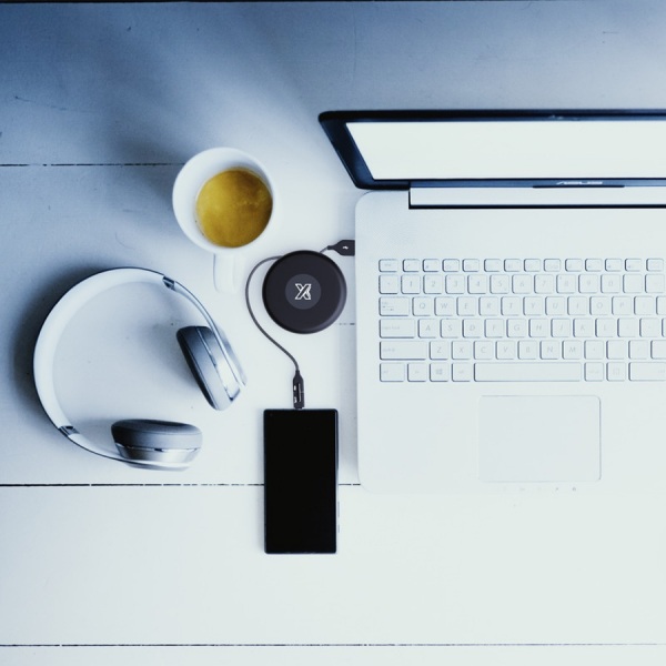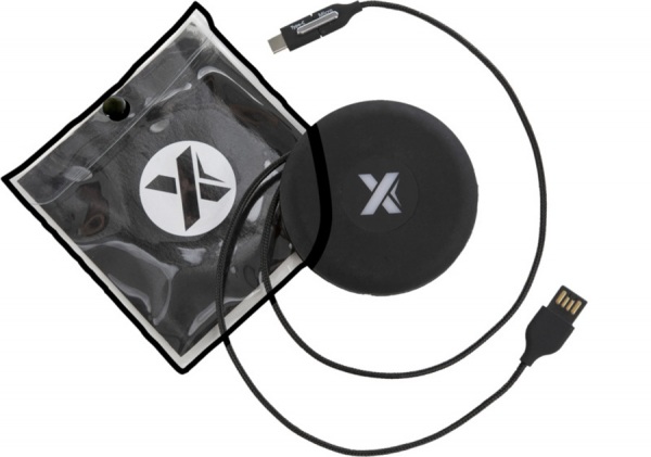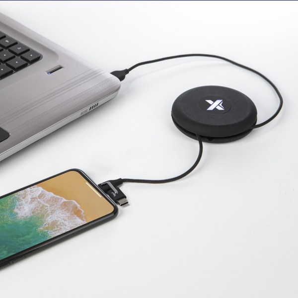 Navíjací nabíjací kábel so svetelným logom a troma výstupnými konektormi (USB-C, Android, iPhone). Silikónové puzdro na prenášanie. Obal je vyrobený z recyklovaného papieru a recyklovaného plastu.