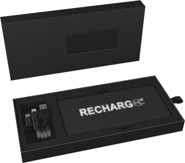 Ultratenká a ultraľahká gumová powerbanka s osvetleným logom a nabíjacím káblom 3v1 (typ C, Android, iPhone). Prístroj sa pri dotyku rozsvieti a logo môže na jedno nabitie svietiť až 20 dní. Kapacita: 5000 mAh. Darčeková krabička.