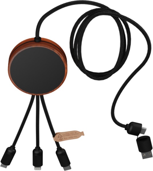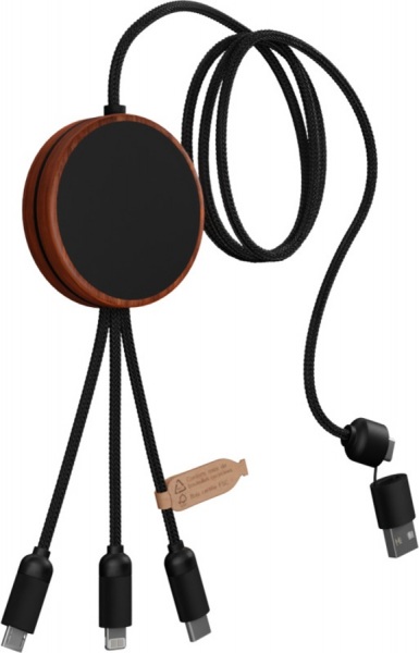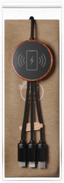 Nabíjací kábel 5v1 so svietiacim logom a 10W bambusovou nabíjacou podložkou. Má 3 konektory (typ C, micro USB, iPhone) a duálny USB konektor pre univerzálne použitie. Dodáva sa v sáčku z TPU s kartičkou z kraftového papiera. Dĺžka: 1 meter. Záruka 3 roky.