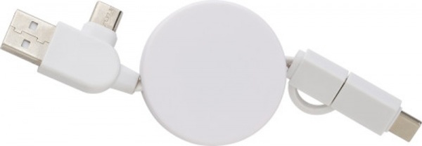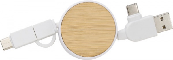 Predlžovací nabíjací kábel s bambusovými detailmi. S USB-C, lightning a USB-A. Jednotlivo balené v hnedom kartónovom vrecúšku.